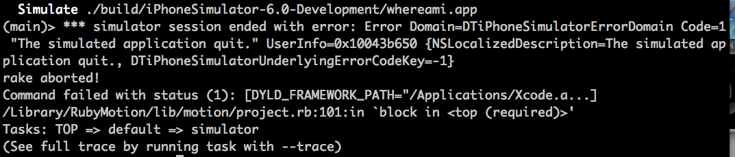 Now I was on my way to making awesome iOS apps in my favorite language. I even get to leverage awesome gems to make life nicer. But there was one big hurdle I ran into: mysterious simulator crashes that left no backtrace.